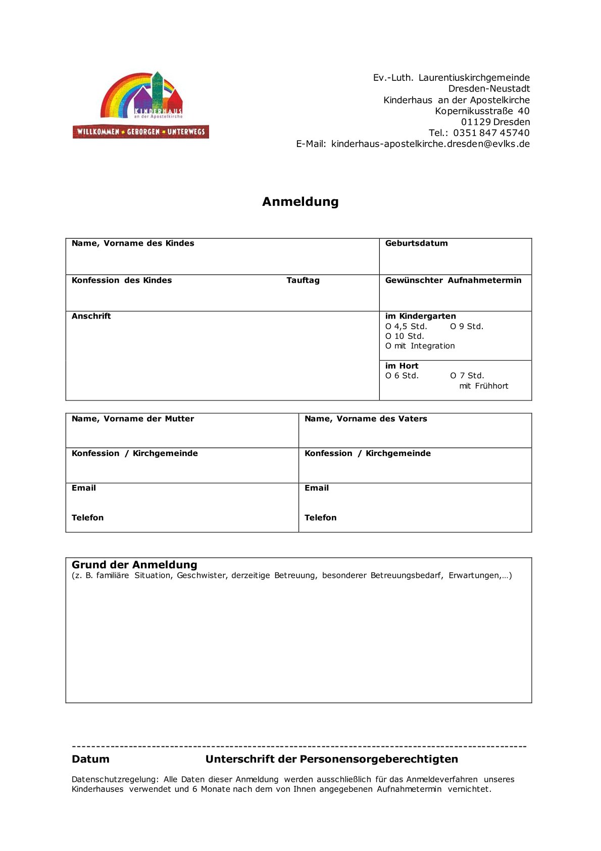 Wenn Sie ihr Kind verbindlich bei uns anmelden möchten, füllen Sie bitte unser internes Anmeldeformular aus und senden Sie uns dieses zeitnah per Post oder Mail zurück. Für das Kita-Jahr 2026/27 nehmen wir noch Anträge entgegen.